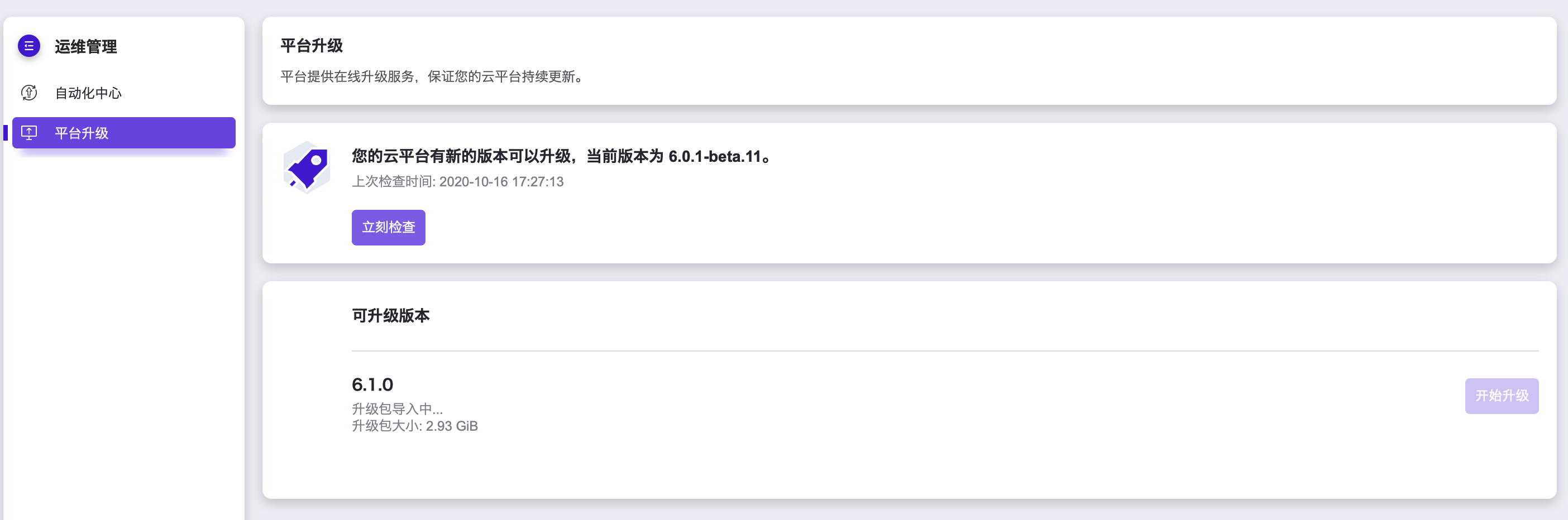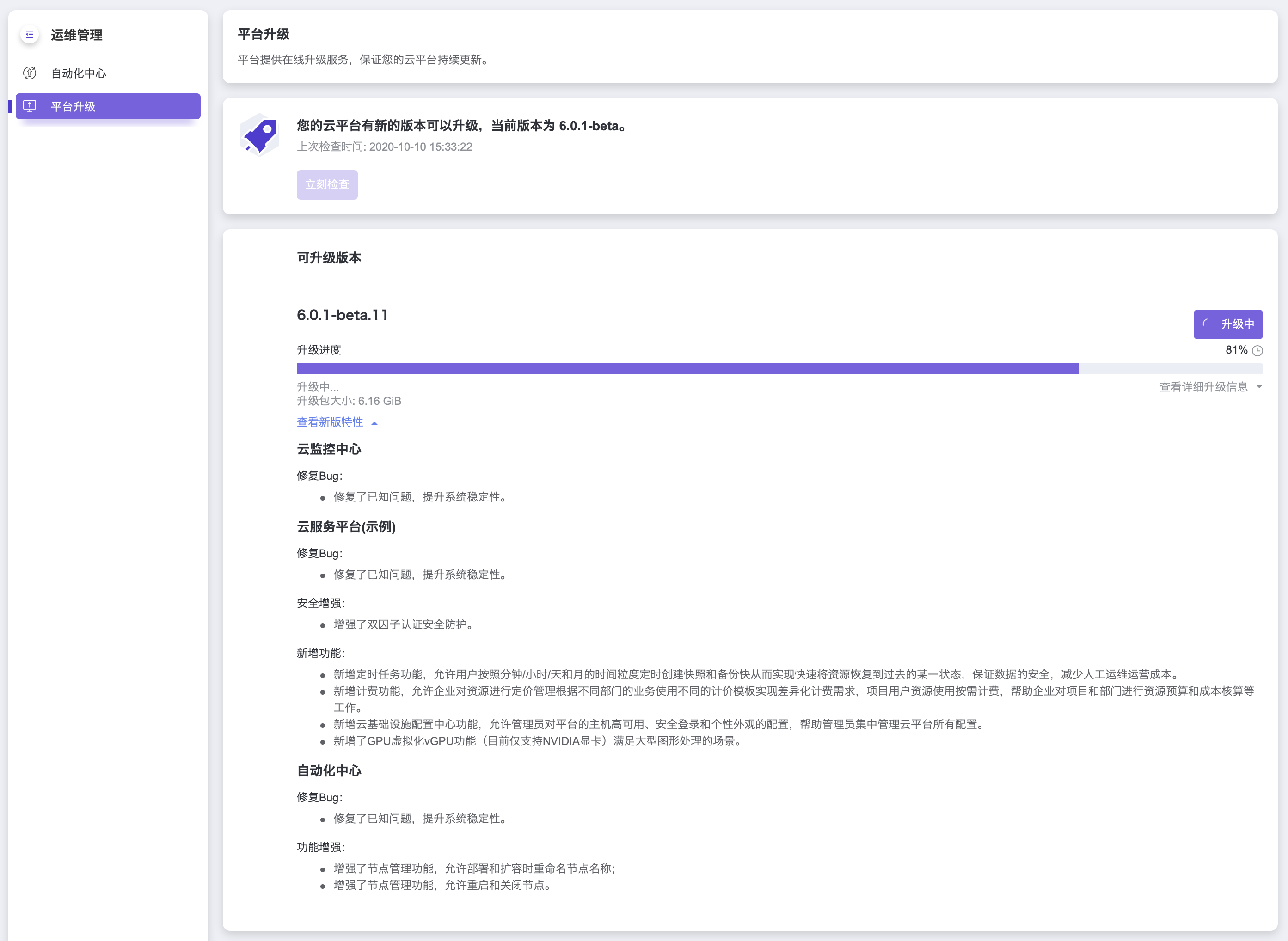 进入 产品与服务 > 运维 菜单,选择 产品升级 并点击立刻检查按钮。若有可用升级包,则会在当前界面显示可用升级包版本号、新版特性和升级包大小。