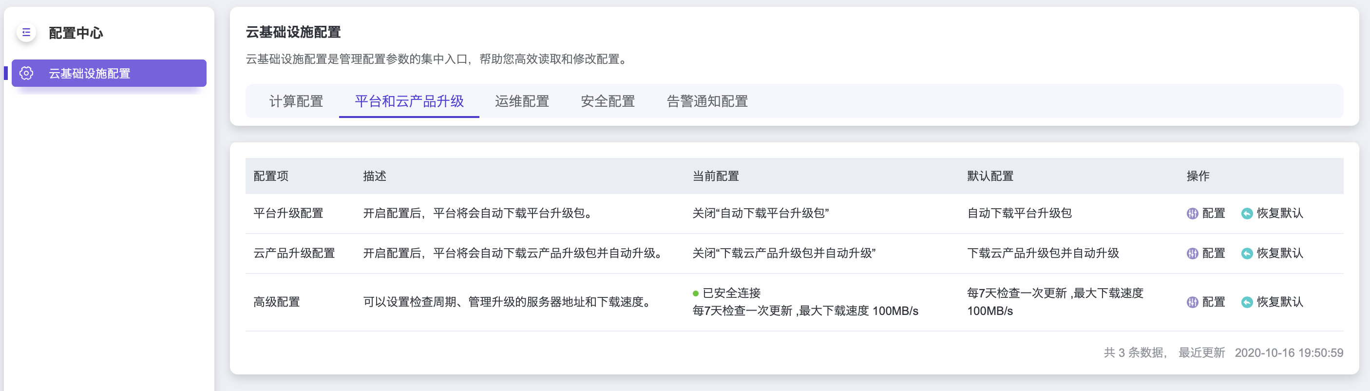 具体设置请前往配置中心 > 平台和云产品升级 入口查看,查看具体描述和帮助请前往 《云管理员指南》> 配置中心 > 平台和云产品升级 章节。