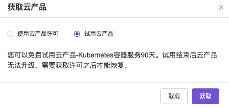 选择“试用云产品”选项,单击 获取 按钮,平台会自动检查是否满足获取云产品所需资源: