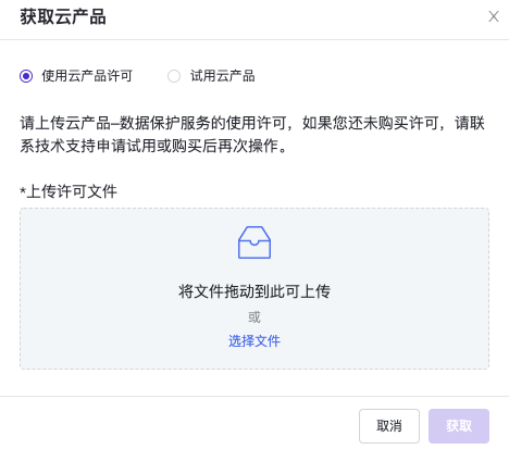 选择“使用云产品许可”选项,将许可文件拖入灰色区域或单击<选择文件>按钮,选择许可文件。
