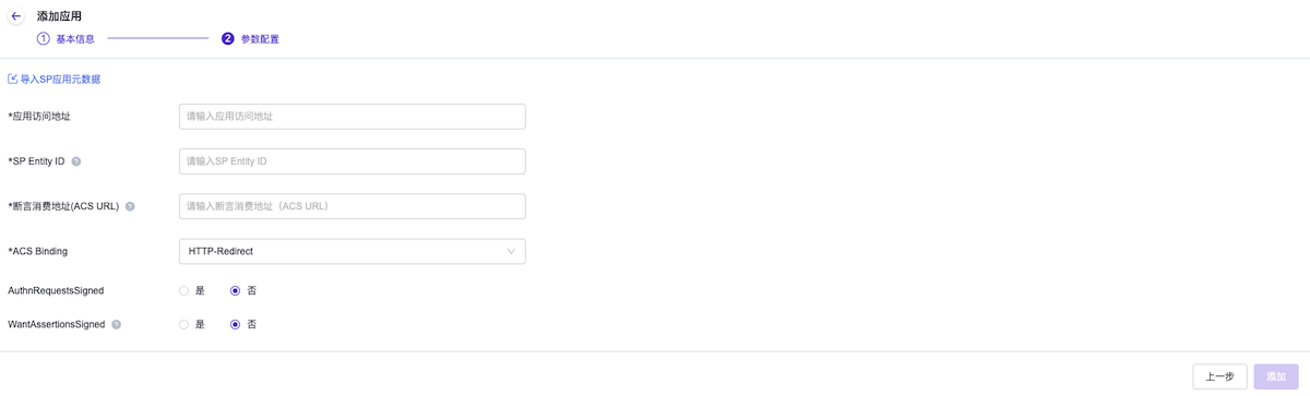 参数 说明 协议 认证或授权时使用的协议。应用添加完成后不支持修改。 单击 下一步 ,配置其余参数。对于使用SAML协议的应用,除手动填写参数外也支持通过导入SP元数据文件自动解析参数,单击导入SP应用元数据并上传相关文件即可。