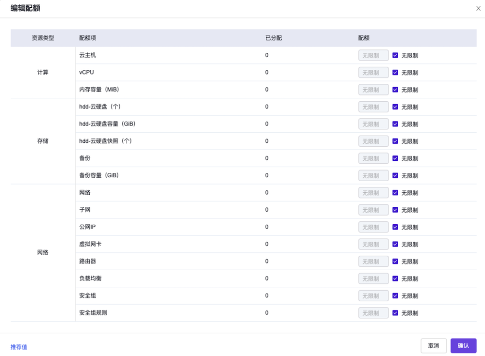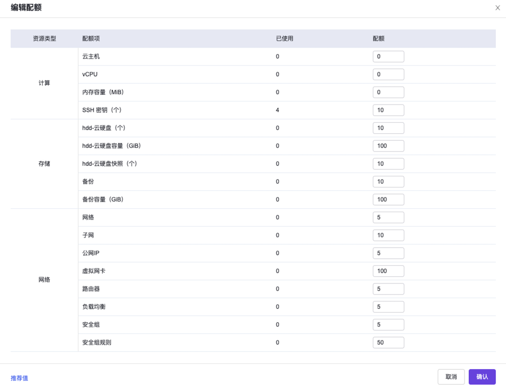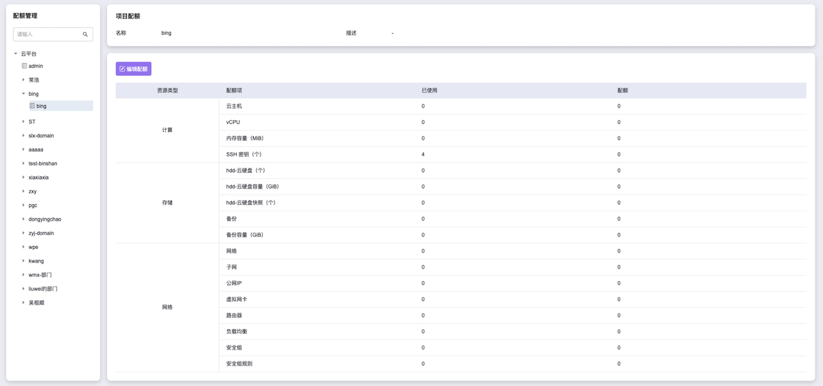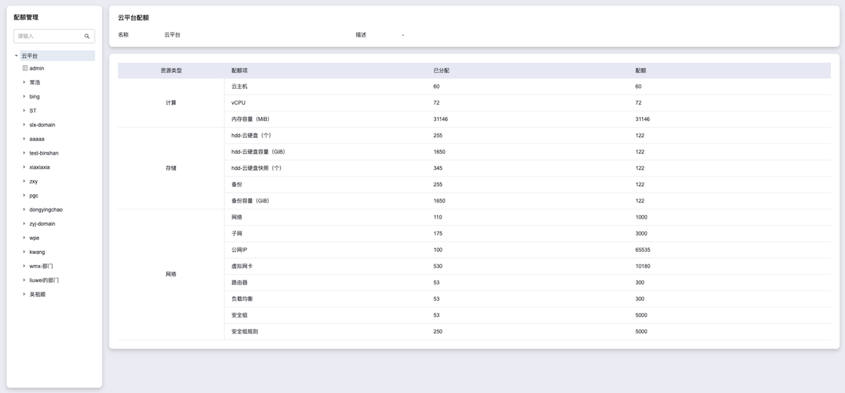 | 云管理员 | * 只可查看云平台的配额。 * 可查看并编辑所有部门和项目的配额。 |