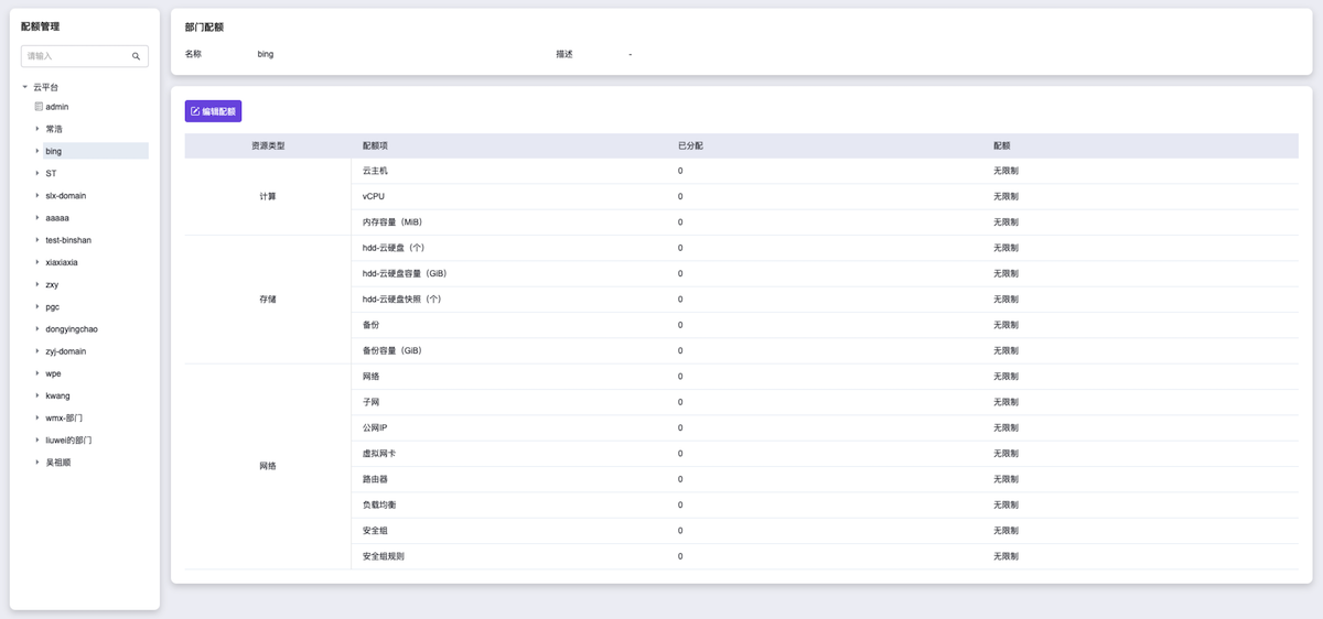 在配额管理页面,选择指定部门,可以查看该部门整体的配额情况,并支持为其设置各资源的配额。具体配额列表信息包括部门名称、描述、资源类型、配额项、已使用和配额。
