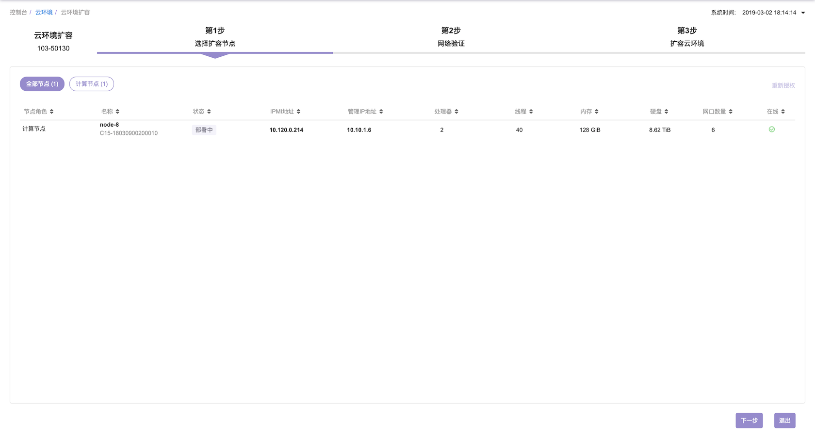 确认节点角色分配信息后,点击下一步按钮,进行 网络验证,网络验证成功后点击下一步按钮,此时您可以点击 开始扩容 。