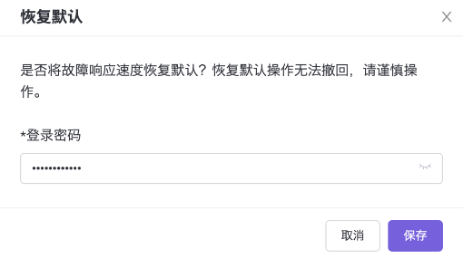 配置,弹出“故障响应速度”对话框。请您务必仔细阅读如下图所示对话框中的提示信息,输入云管理员登录密码后,单击