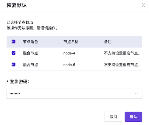 恢复默认,或分别单击待操作节点所在行的恢复默认,弹出“恢复默认”对话框。输入云管理员登录密码后,单击
