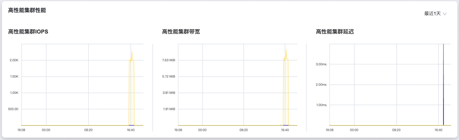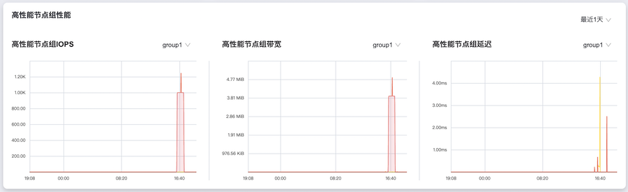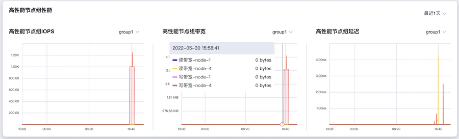 在“概览”页面的“高性能节点组性能”区域框中,支持按照单个高性能节点组的方式查看每个高性能节点组在不同时间长度范围内的总读写IOPS、读写带宽和读写延迟。其中,支持筛选的具体时间长度范围包括最近30分钟、最近1小时、最近3小时、最近6小时、最近12小时、最近1天、最近3天、最近1周、最近1月或最近1年。
