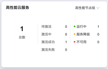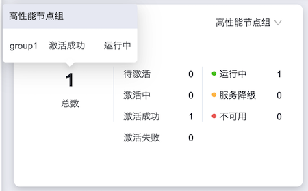 高性能节点组:统计整个高性能云存储集群中高性能节点组的总数、以及各激活状态、服务状态的节点组个数。