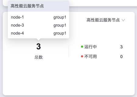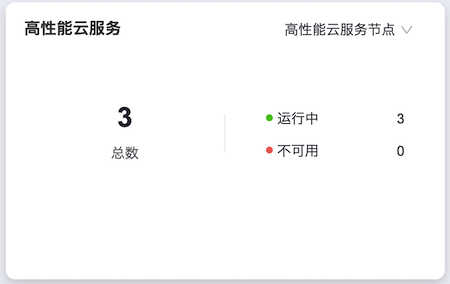 高性能云服务节点:统计高性能存储集群内高性能云服务节点的总数,以及高性能云服务节点在“运行中”和“不可用”状态下的数据情况。