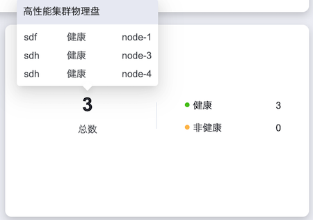 当移动鼠标光标至具体数字上时,可以查看总数和各健康信息类别下物理磁盘的详细信息,包含物理磁盘的名称、健康状态和所属的高性能云服务节点。