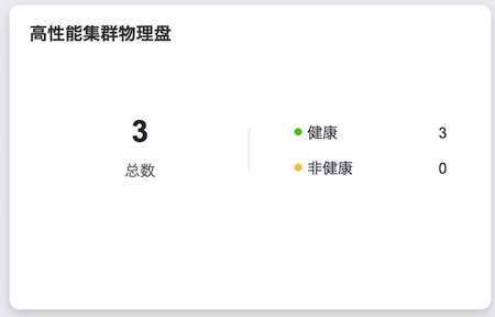 在“概览”页面的“高性能集群物理盘”区域框中,支持查看高性能云存储集群中,所有高性能云服务节点上物理磁盘的总数以及各健康状态的个数。