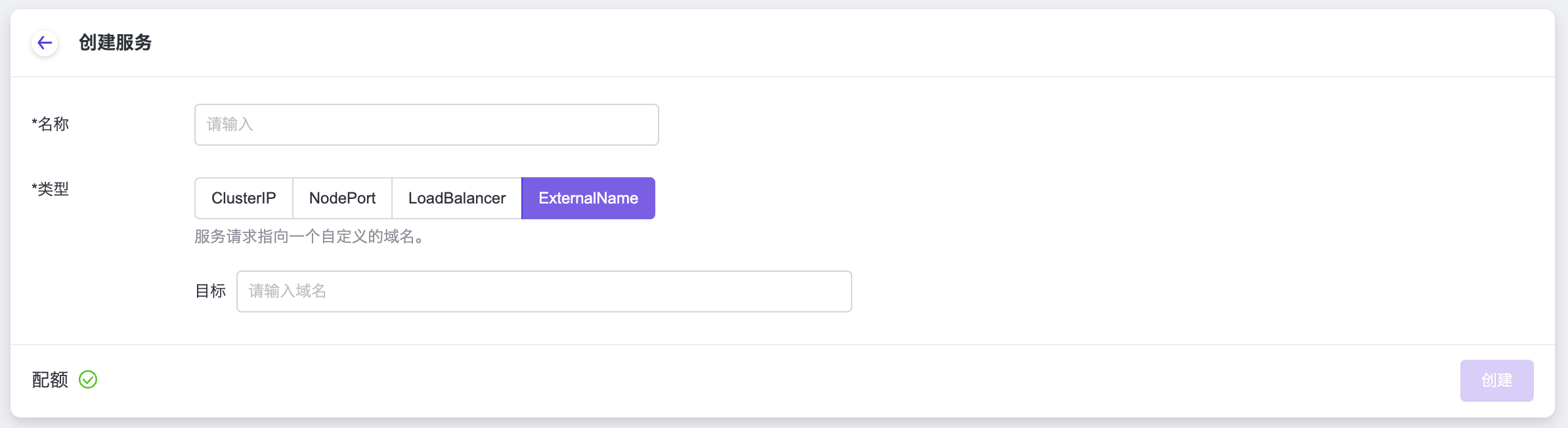 参数 说明 名称 自定义服务名称,可与工作负载名称保持一致。 类型 选择“ExternalName”类型。 目标 指向一个自定义的域名。
