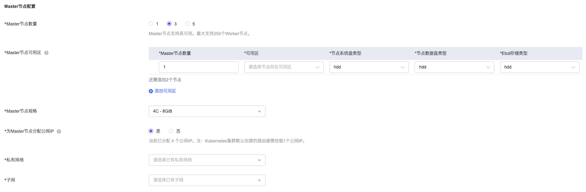 参数展示形式与Master节点数量有关,下图为Maste节点数量选择3时的界面形式,参数说明以本图形式为依据进行介绍。