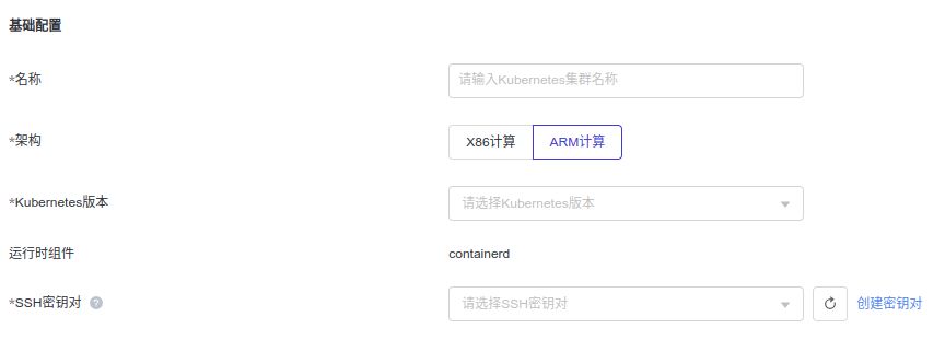 密钥对由一个公钥和一个私钥组成,用于外部客户端通过SSH远程登录Kubernetes集群的任意节点。在下拉框中选择所需密钥对,若尚不存在,可单击 创建密钥对 进行创建。创建后的密钥对可在[产品与服务]-[计算]-[SSH密钥对]中查看。平台只保存公钥,请妥善保存您的私钥。 |