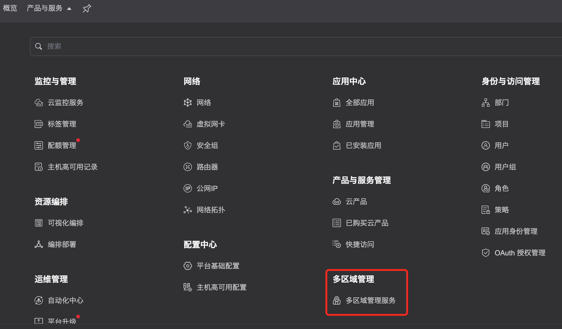 云产品升级完成后,即可使用云产品提供的新功能。在云平台的顶部导航栏中,依次选择[产品与服务]-[多区域管理],就可以看到产品相应功能了。如图: