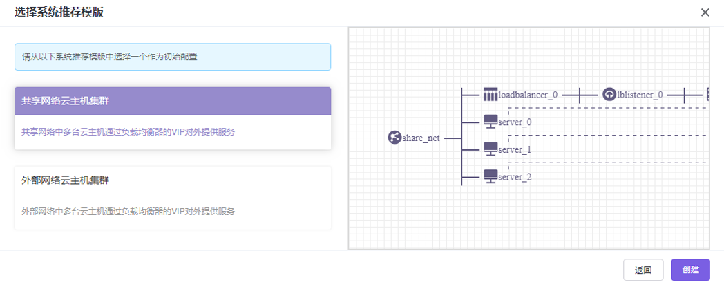 用户可以选择 共享网络云主机集群和 外部网络云主机集群,根据不同场景需求,选择不同类型系统推荐模版,同时右侧也会出现模版相应的可视化图形以及模版描述,方便用户对模版理解,做出合适选择。如下以共享网络云主机集群为例。