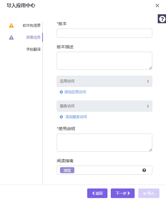 点击 下一步,当该应用存在多个版本时,您需要填写其版本名称,如1.0.1, 版本描述 是对当前版本信息的描述,与应用 描述 不冲突。若您需要为您的应用或应用中的服务提供快捷访问入口时,您可在 应用访问 和 服务访问 下分别添加选项。(警告:您选择的应用/服务端口号应与您选择安全组端口范围匹配。) 使用说明 是对面向使用该应用用户的操作方法说明。
