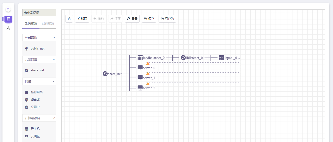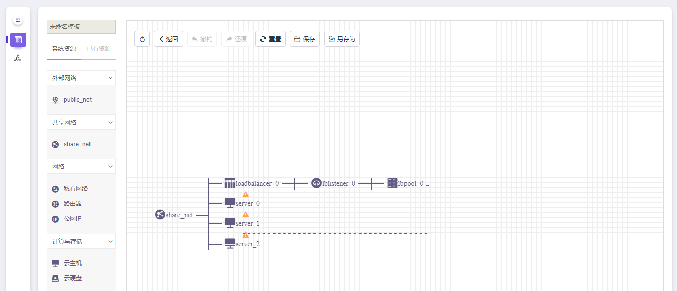 2.此时画布上的呈现资源为已选择的 共享网络云主机集群 资源,用户可对该模版进行编辑部署,增加 云主机、云硬盘、负载均衡器 数量,或更改资源配置,操作如上文中的 从零开始创建。