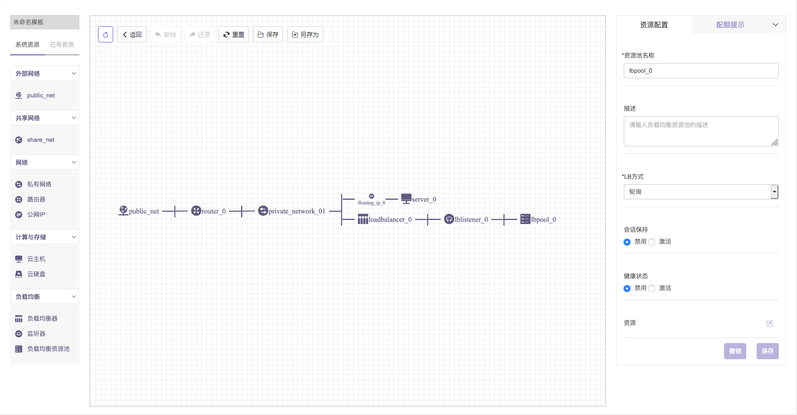 此时画布呈现的资源为用户所选的模版资源,用户可对该模版进行编辑部署,增加 云主机、云硬盘、负载均衡器 等数量,或更改资源配置,操作如上文中的 从零开始创建。