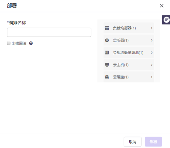 保存模版页面底部有三种操作,仅保存、立即部署 以及 导入应用中心,选择 立即部署。(警告:三种状态一次仅能执行一种操作。)此时页面将跳出部署弹窗,如下页面。编排名称 默认与您刚才填写的模版名称一致,也可以再编辑,若勾选出错回滚,意味着当您创建编排失败时,该资源编排会自动删除。