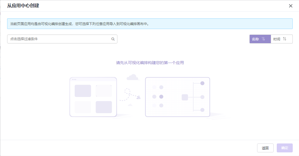 在可视化编排页面点击 创建模版,跳出如下弹窗,选择 从应用中心创建,点击确定。