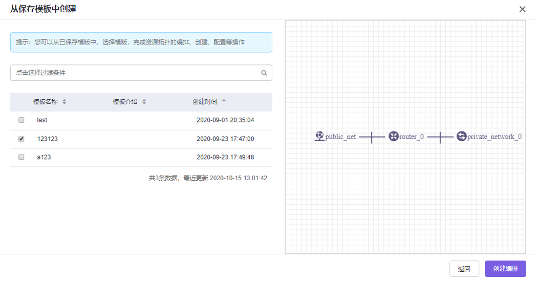 从保存模版中导入:用户在创建模版时,可临时保存模版的状态,并可通过该方式再次选择该模版,完成资源拓扑的编排、创建、配置等操作。模版在保存状态中也不会占用系统资源,极大地方便了用户的资源管理,同时通过该功能也可自定义模版,以涵盖多样性业务场景,满足用户需求。