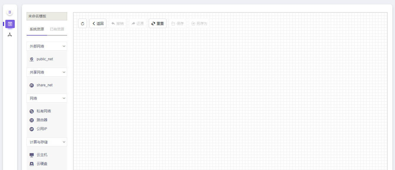 - 选择 共享网络云主机 后,点击确定,进入可视化画布,如下页面。