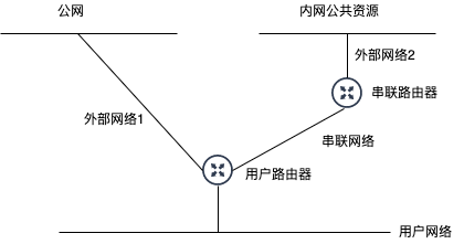 | 串联路由器 | * 名称:series_router * 可用区:如需保证两个外部网络的访问物理隔离,请指定单独的可用区,并确保该可用区已配置独立的网络节点。 * 路由器网关:172.16.0.10(开启SNAT) * 路由器连接: - 子网:series_network_default_ipv4_subnet:169.254.128.0/24;子网IP:169.254.128.3 * 静态路由: - 目的CIDR:10.0.0.0/24;下一跳:169.254.128.2 |