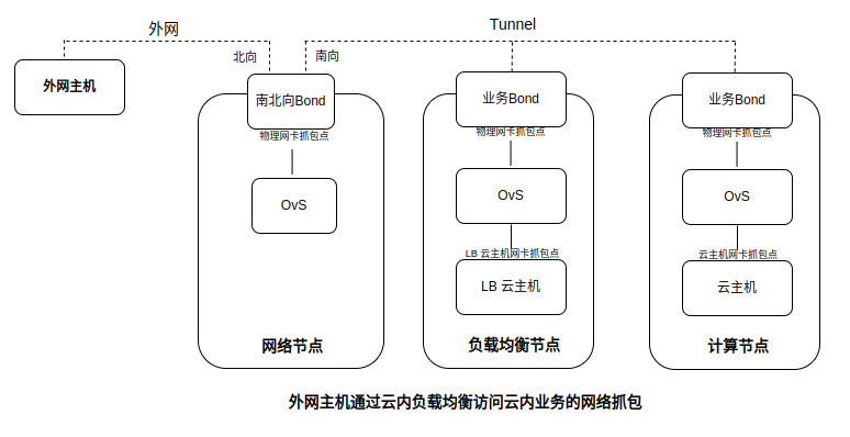 查看负载均衡节点到计算节点上的云主机之间的时延,可选择LB云主机1的虚拟网卡,LB云主机2的虚拟网卡,计算节点的业务Bond物理网卡,云主机的虚拟网卡这4个抓包点进行时延查看。