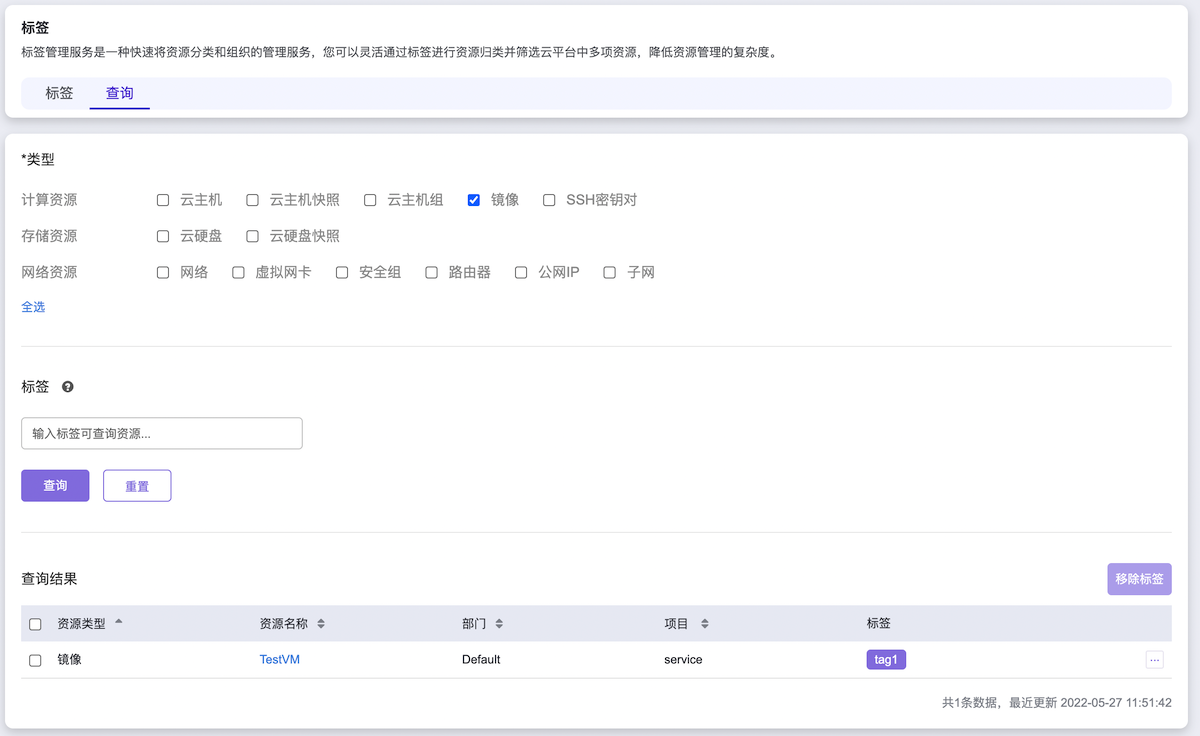 本操作用于在云平台中确认标签与资源已成功绑定。 在顶部导航栏中,依次选择[产品与服务]-[监控与管理]-[标签管理]后,选择[查询]页签,进入“查询”页面。 输入查询条件后,单击 查询 ,在当前页面下方的资源列表中查看满足条件的所有资源。 说明: 在输入资源查询条件时,允许同时输入多个标签,但最多只支持同时输入10个。 当同时输入多个标签查询资源时,最终查询结果是同时绑定这些标签的资源。